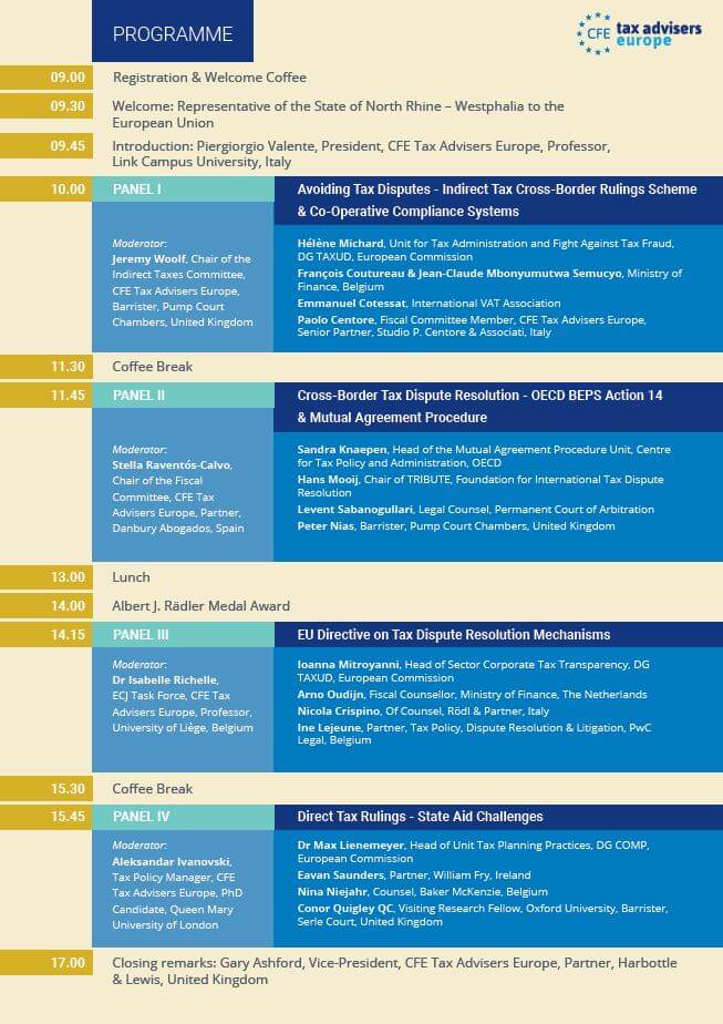 The 2019 CFE Tax Advisers Europe Forum will examine existing compliance mechanisms under Action 14 of the BEPS Action Plan and Mutual Agreement Procedure, as well as the EU Dispute Resolution Mechanisms Directive. The Forum will further discuss means of avoiding disputes, such as confirmatory tax rulings, advance pricing agreements (APAs) and exchange of information. The Forum will also question the impact of potential further revisions of international taxation principles and corporate taxation reform contained in the EU anti-tax avoidance directives on tax certainty.